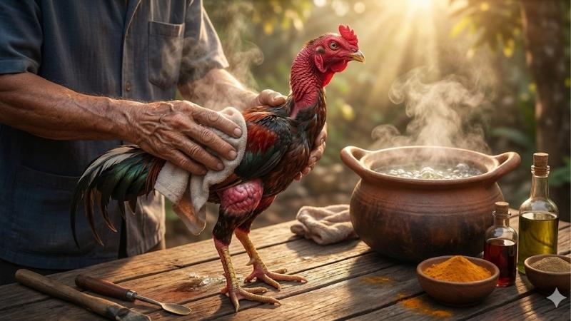 Quy trình “xả nghệ” sau đó cũng quan trọng không kém để giúp da gà thoáng khí và đàn hồi trở lại. Kết hợp với việc xoa bóp bằng rượu thuốc hàng ngày sẽ giúp gà lưu thông khí huyết, tan mỡ thừa và cơ bắp trở nên rắn chắc như thép nguội. Đây là bí quyết gia truyền tạo nên vẻ đẹp dũng mãnh của gà nòi Việt.